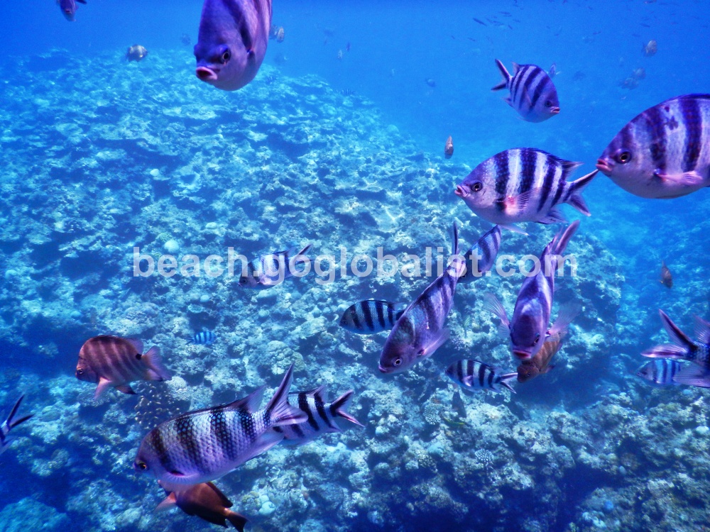 途中、いたるところにカラフルな熱帯魚が泳いでいて、ガイドさんが餌付けをします。エサをバラ撒かなくてもすぐ近くにたくさん魚がいるのに、エサを撒くと更にすごい勢いで魚が寄ってきます。上の写真なんてまだまだいい方。もっと魚ばかりで前が見えなくなるほど寄ってきますよ。