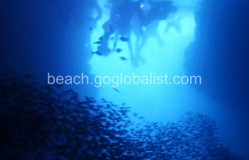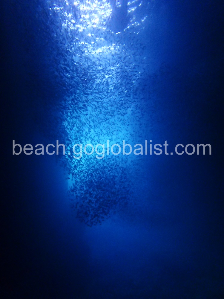 上の写真は、少し潜って水中から上を見上げて撮影したものです。青い光の中に無数の小魚が写っていてとてもきれいですね。